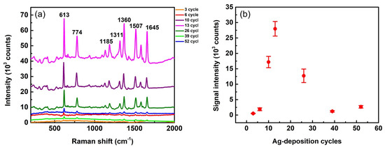 It is reasonable to assume that the SERS enhancement power of substrates is highly dependent on their silver morphology, which is dominated by the Ag-growth condition. The condition for the maximum enhancement can be found via a systematic study of Ag-growth cycles, as shown in Figure 5. We used R6G solution of 10−5 M as a probe for this study. Several Raman peaks of R6G can be observed in the SERS spectra presented in Figure 5a. The most prominent peak at 613 cm−1 (in-plane xanthene ring deformations) was used to estimate the SERS enhancement power of the corresponding substrates. Peak intensities of 613 cm−1 vary with different growth cycles. We used this peak as an indicator to quantitatively plot signal intensities as functions of Ag-deposition cycles, as shown in Figure 5b. This figure clearly indicates that the substrate with Ag deposited at 13 cycles provides the highest SERS peak intensity and thus the maximum enhancement power. In other words, SERS intensity is sensitive to deposition cycles. For example, the intensity of a 13-cycle case (26,000 counts) is 11 times higher than that of a 6-cycle case (2400 counts) and 13 times higher than that of a 39-cycle case (2000 counts). These huge differences indicate that Ag-growth conditions need to be carefully selected for fabricating substrates with high SERS EF.