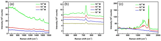 SERS spectra of (a) eosin Y, (b) adenine, and (c) methylene blue with different concentrations. The spectra are pristine with neither intensity shift nor background subtraction. The laser wavelength of 532 nm and lens of 50× were used for the measurement. The exposure times are 1 s for (a), 3 s for (b), and 10 s for (c).