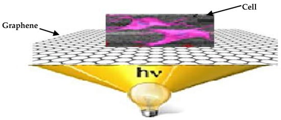 Graphene can rapidly transform light into electricity on a femtosecond time scale through the use of a hot-carrier multiplication process, making it particularly appealing for new applications in photonics and optoelectronics. Graphene sheets seem to be a subject of increasing interest, with substantial research being conducted for use in the development of novel composites [26,27]. These one-of-a-kind nanomaterials offer enormous promise in applications such as electrochemical sensors, power storage, catalysis, enzyme adsorption, bioimaging, biomedical applications, and biosensors [28,29,30,31]. Geim and Novoselov [32] extracted graphene from graphite utilizing mechanical cleavage and sticky tape for adhering graphene layer flakes. Graphene sheets and graphene quantum dots (GQDs) have remarkable qualities that make them more appealing for usage in the electrical, optoelectronic, and aerospace sectors. [33,34,35]. In this work, the authors developed an innovative solution to the problem of non-invasive optical stimulation of cells. A Graphene-based optical stimulator that is placed on the exterior of a physiologically and functionally viable cell is illustrated in Figure 1.