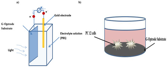 A Faradaic reaction can cause unwanted severe cell degradation and electrode damage as a result of a redox electrochemical reaction involving living organisms in solution and electrodes. As a result, non-faradic charge transfer photo-stimulation is always preferable. A pH reading is the most accurate way of determining this. The pH of the electrolytic solution containing immersed G-optrodes remained constant after 30 min of continuous light illumination, as evaluated directly after fabrication (day 0) and one month later (day 30). Figure 8b strongly indicates that the Faradaic mechanism is not at work [12,47]. This is due to the fact that the authors did not use a voltage bias, and photogenerated electrons in the graphene layer have a lifetime in the femtosecond range. It is expected that photogenerated currents will be negligible [48,49].