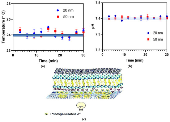 Figure 8a shows that the surface temperature of G-optrodes did not change after a continuous 30 min exposure to light (n = 3), recorded immediately after fabrication (day 0) and after one month (day 30) with a 100 mW/cm2 illuminance. The data will be presented as mean SEM. Figure 8b demonstrates that there were no changes in the pH of an electrolytic solution covering the G-optrode with a thickness of 20 nm and 50 nm surface throughout a continuous 30 min exposure to light (n = 3). Authors have examined the changes immediately after fabrication (day 0) and after one month (day 30) with a 100 mW/cm2 irradiance. The schematic depicting the proposed methodology of optical stimulation of cells employing light-activated G-optrode bio-interfaces is shown in Figure 8c.