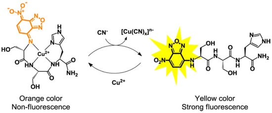 Cyanide can impair the cellular functions of metalloenzymes by binding with the metal cofactors. Thus, cyanide is considered to be one of the most toxic anions, even at a very low concentration. Jung et al. designed a peptide-based system for the detection of cyanide in aqueous solution based on the ATCUN motif, in which the tripeptide Ser-Ser-His (NBD-SSH) was labeled by 7-nitro-2,1,3-benzoxadiazole at the N-terminal (Figure 1) [48]. The formation of the NBD-SSH–Cu2+ complex resulted in the color change of the probe from yellow to orange, which was accompanied by the fluorescence quenching. The addition of CN− successfully removed Cu2+ from the complex. As a result, the solution color turned yellow, and the fluorescence signal was enhanced. This method realized the highly sensitive detection of CN− through the colorimetric and fluorescent analysis. This method is the first example of using a peptide-integrated system to sensitively detect cyanide in 100% aqueous solution. Other anions, such as F−, Cl−, Br−, I−, NO3−, SCN−, AcO−, HCO3−, SO42−, ClO4−, HPO42−, and HAsO42−, showed no significant effect on the colorimetric detection of cyanide. Recently, Wang et al. reported a bifunctional peptide probe (FLH) based on fluorescence “on-off” response and colorimetric analysis [43]. In this method, FLH could detect Cu2+ quickly and selectively with a detection limit as low as 1.5 nM, and the formed FLH-Cu complex showed a colorimetric change and a “signal-on” response to CN− with a detection limit of 12.7 nM. Interference experiments showed that other ions did not induce the change of solution color from light yellow to orange under natural light, and the effect of other ions on the fluorescence intensity was negligible. Finally, the probe was successfully applied to monitor Cu2+ and CN− in living cells through fluorescence imaging.