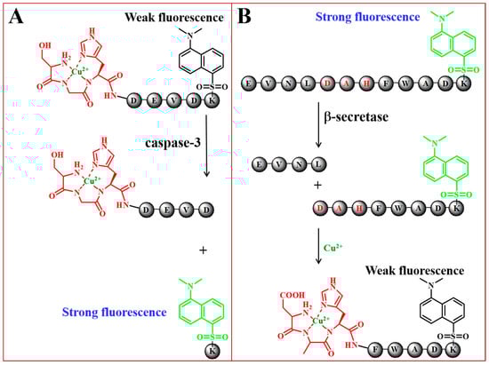 Based on the high binding affinity of ATCUN peptide and Cu2+ and the high inherent quenching ability of Cu2+ toward the fluorophore, Deng et al. proposed a single-labeled peptide probe for the detection of protease (Figure 2) [50]. In this work, two proteases, caspase-3 and β-secretase, were determined in a “signal-on” and “signal-off” format, respectively. For the detection of caspase-3, the Dns group was labeled at the C-terminal of peptide. Cu2+ could be coordinated by the peptide probe SGHDEVDK-Dns through the interaction with the ATCUN motif (SGH) at the N-terminal, thus leading to the fluorescence quenching. Once the peptide was catalytically cleaved by caspase-3, the released fragment of K-Dns exhibited high fluorescence signal even in the presence of Cu2+. For the assay of β-secretase, the fluorophore was labeled at the N-terminal of peptide. The probe EVNLDAHFWADK-Dns had a low binding affinity toward Cu2+ and showed a high fluorescence signal. Once the probe was cleaved by β-secretase, Cu2+ would be coordinated by the ATCUN moiety (DAH) in the released DAHFWADK-Dns segment, thus leading to the fluorescence quenching.