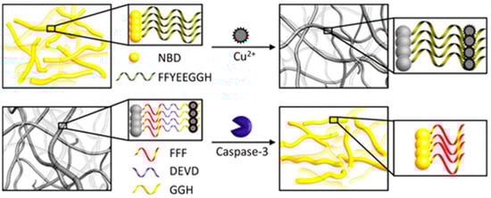 Schematic representation of the NBD-FFYEEGGH and NBD-FFFDEVDGGH nanofibers for the detection of Cu2+ and caspase-3. Reprinted with permission from [55]. Copyright 2014 American Chemical Society.