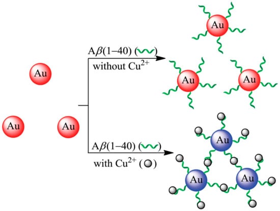 Schematic illustrations of the AuNP-based colorimetric mechanism for Aβ (1–40) detection upon addition of Cu2+. Reprinted with permission from [60]. Copyright 2015 John Wiley and Sons.