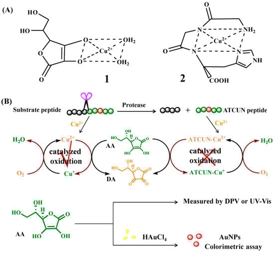 (A) Chemical structure of Cu2+ complexes with AA (1) and GGH (2, the minimalist version of ATCUN motif). (B) Schematic representation of the Cu2+/Cu+-initiated redox cycling for protease detection. Reprinted with permission from [65]. Copyright 2018 Elsevier B.V.