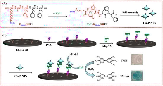 Schematic illustration for (A) the preparation of Cu–PNPs by the self-assembly of KbiotinGHFF/Cu2+ and (B) the colorimetric immunoassay of PSA by Cu2+-catalyzed oxidation of TMB. Reprinted with permission from [69]. Copyright 2020 Springer Nature.