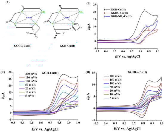 (A) Chemical structure of GGGG-Cu(II) and GGH-Cu(II) complexes. (B) CVs of Cu(II) complexes with GGH, GGHG, and GGH-NH2 peptides at the scan rate of 100 mV/s. CVs of GGH–Cu(II) (C) and GGHG–Cu(II) (D) at different scan rates. The concentrations of peptide and Cu(II) are 600 μM and 400 μM, respectively. Reprinted with permission from [84]. Copyright 2018 Elsevier B.V.