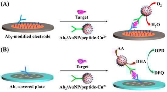 Schematic representation of the electrochemical (A) and fluorescent (B) immunoassays with AuNP/peptide-Cu2+ conjugates as the nanolabels for the electrocatalytic reduction of oxygen and the catalyzed oxidation of AA, respectively. The resulting oxidization product DHA was reacted with OPD to form fluorescent DFQ. Reprinted with permission from [87]. Copyright 2022 Elsevier B.V.