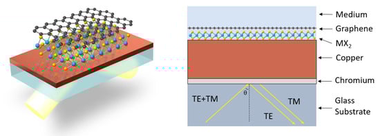 The proposed sensing configuration is consisted of the following components: SF11 triangular prism, BK-7 substrate, a chromium layer, a thin copper film, layers of one of the types of transition metal dichalcogenides: MoS2/MoSe2/WS2/WSe2 (defined as MX2), a graphene layer for capturing the targeted sample molecule, and a sensing layer with biomolecular analyte. Kretschmann’s attenuated total reflection (ATR) structure is chosen for this surface plasmon resonance sensor model. An illustration of the configuration is in Figure 1 [22].