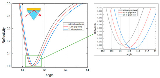The dip of the curve was shifted to the larger angle of incidence by increasing the number of graphene layers and having a lower value. The curve with the lowest reflectivity corresponds to the substrate with 2 layers of graphene. This dip in reflectance indicates the resonance angle for a given configuration and excitation wavelength. Most of the p-polarized light intensity was absorbed and thus leading to a strong resonance at the SPR angle when resonance occurred. Due to strong surface plasmon polariton coupling, minimum intensity reflected light was then detected.