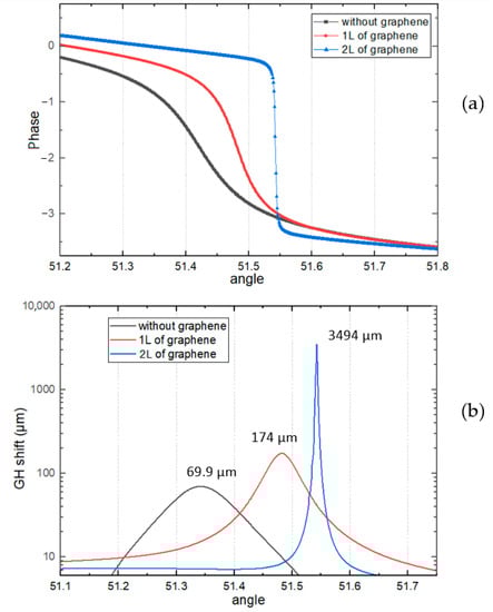 In Figure 3a the phase change is shown corresponding to the structures with different number of graphene layers. The quasi-vertical phase change in SPR angle is obtained for 2 layers of graphene, therefore it has a higher value for GH shift, as shown in Figure 3b.
