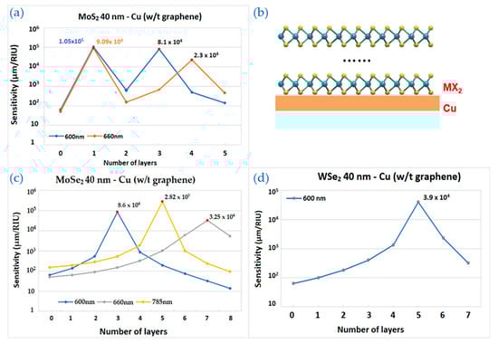 The sensitivity values of the enhanced model by number of TMDC layers with 40 nm of copper: (a) The wavelengths are 600 nm and 660 nm for MoS2 layers; (b) the schematic structure; (c) The wavelengths are 600 nm, 660 nm, and 785 nm for MoSe2 layers; (d) The wavelength is 600 nm for WSe2 layers and 40 nm of Cu.