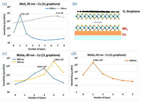 In Figure 5c, the highest sensitivity quantity received is 3.85 × 104 µm/RIU for 4 layers of MoSe2 on 40 nm Cu substrate at 785 nm. The sensitivities at 600 nm are also shown for comparison and its peak corresponding to 3 layers equals to 5.65 × 103 µm/RIU.