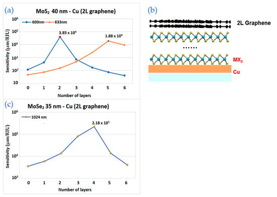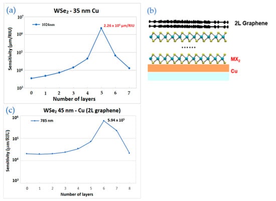 In Figure 6c, there is a curve corresponding for 35 nm of Cu in near infrared wavelength range—1024 nm and with 2 layers of graphene. Sensitivity increases gradually starting from 0 up to 4 layers of MoSe2, where reaches its highest value—2.18 × 105 µm/RIU and decreases with a further addition in the number of layers.