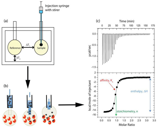 Schematic illustration of a typical ITC measurement (a) Scheme of a typical ITC instrument (∆T1, ∆T2—the temperature difference between the two cells, and the cell and adiabatic jacket, respectively, both are zero during an experiment); (b) Illustration of the binding process when target is injected into the cell containing aptamer. (c) Thermogram showing interaction of an aptamer with its target: (top) the raw titration data showing the heat resulting from each injection of the target into the aptamer solution; (bottom) the integrated heat (after subtraction of the heat of dilution) fitted to a 1:1 binding model (experimental data from [72], results: KD = 0.20 ± 0.05 µM, ∆H = −14 ± 1 kcal/mol, n = 0.98). Reproduced from [73] (open access).