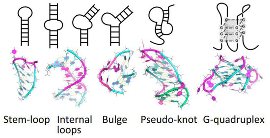 Secondary structural elements and motifs found in nucleic acids (above), and the representative three-dimensional structures for RNA from Protein Data Bank (aquamarine and green: nucleobases involved in base pairing or G-quadruplexes; magenta: other bases). Reproduced with permission from ref. [97]. Copyright 2022, Elsevier.