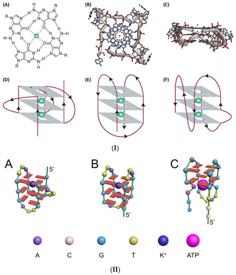 (I). G4 structure: (A) G-quartet with the central cation (green) coordinated to oxygen atoms; (B,C) crystal structure of human telomeric G4s (Protein Data Bank: 1KF1)—top and side view, respectively; (D–F) schematic illustration of G4s based on the strand orientation: (D) parallel, (E) antiparallel, and (F) hybrid with a bulge. Reprinted from [112] (open access); (II). (A) K+ aptamer: hybrid conformation, (B) K+ aptamer: anti-parallel conformation, and (C) ATP aptamer: anti-parallel conformation. Reprinted with permission from ref. [115]. Copyright 2021, American Chemical Society.