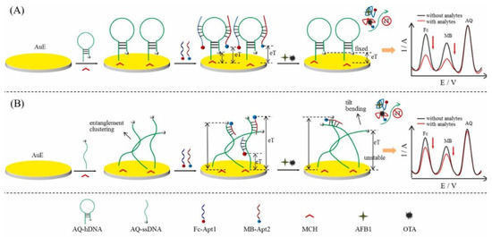- Zhu, C.; Liu, D.; Li, Y.; Ma, S.; Wang, M.; You, T. Hairpin DNA assisted dual-ratiometric electrochemical aptasensor with high reliability and anti-interference ability for simultaneous detection of aflatoxin B1 and ochratoxin A. Biosens. Bioelectron. 2021, 174, 112654. [Google Scholar] [CrossRef] [PubMed]