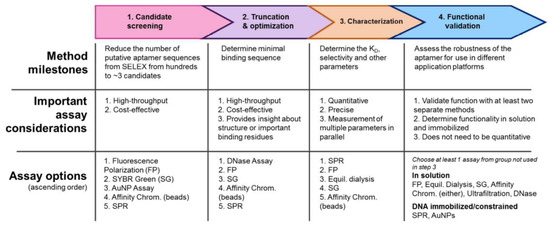 The workflow diagram proposed by McKeague et al. for the screening, truncation, characterization, and functional validation of a small molecule binding aptamer to ascertain an optimal integration into specific applications. Reprinted with permission from ref. [25]. Copyright 2015, American Chemical Society.