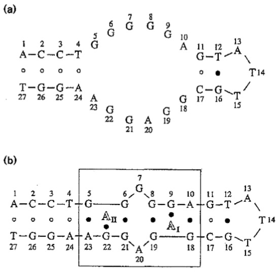 (a) The sequence and Watson-Crick pairings for the original 27-mer ATP-binding DNA aptamer selected by Huizenga and Szostak [109] (b) The secondary structures determined by Lin and Patel for the original ATP-binding aptamer. The two binding sites are designated AI and AII. Reprinted with permission from ref. [119]. Copyright 2022, Elsevier.