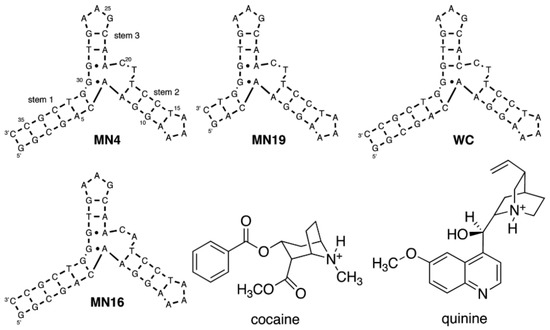 Subsequent affinity studies performed by Sachan et al. on the initial cocaine aptamer demonstrated that MNS-4.1 also binds some of the cocaine metabolites and aminoglycosides, with similar or higher affinities [130]. Interestingly, circular dichroism and fluorescence measurements did not show any evidence of large structural rearrangement of the cocaine aptamer upon target binding, and it was concluded that the aptamer specificity must be the consequence of its interaction with all faces of the cocaine molecule [130].