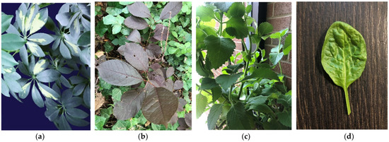 From left to right, the plants tested are (a) Schefflera arboricola, (b) Prunus virginiana, (c) Coleus amboinicus, and (d) Spinacia oleracea.