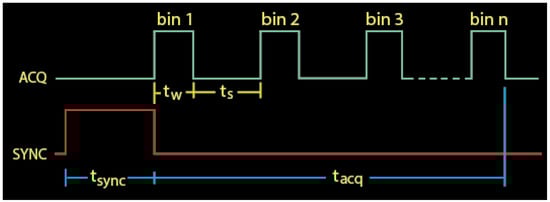 Each bin is sequentially “opened” for duration tw, called the bin width, during which photons are counted. The time between successive bins is called the bin space, ts. The bin width can be set anywhere between 800 ns and 4 ms, the bin space can be set between 1 μs and 32.7 ms or set to zero, and the SYNC pulse can be set between 2 μs and 8.35 s. The total acquisition time, tacq, is