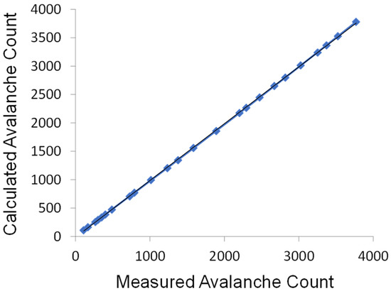 As the PCS121 allows us to set voltage thresholds for detection, we ascertained the accuracy of our algorithm for estimating higher-order avalanche counts by comparison to direct measurement obtained by the method described in the Supplementary Materials. The result is presented in Figure 5 showing a near perfect linear behavior of the calculated avalanche count vs. the measured avalanche count, with R2 value of 0.9999. These results indicate an excellent correlation, implying it is not necessary to measure the voltage of each avalanche event and instead it can be very accurately counted.
