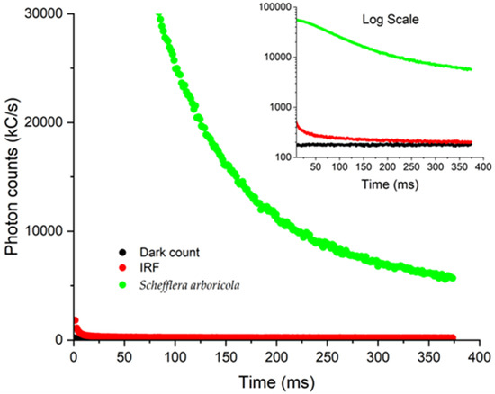 Photon vs. time curves plotted for the dark counts (black), the background blank including the IRF (red), and a sample delayed fluorescence response curve from Schefflera arboricola leaf (green). Inset is the log plot.