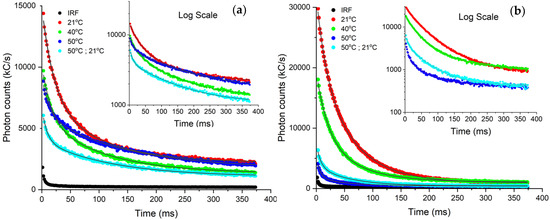 Photon lifetime curves acquired from our York DF Photon Counting Device for heat stressed: (a) Prunus virginiana and (b) Coleus amboinicus. The plants were subjected to temperatures 21 °C (red), 40 °C (green), 50 °C (blue), 50 °C returned to ambient (cyan). Black line indicates the instrument response function.