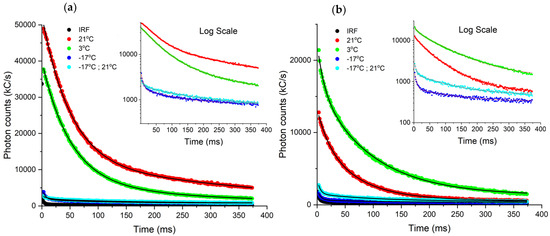 Photon lifetime curves acquired from York DF Photon Counting Device for chill stressed: (a) Spinacia oleracea and (b) Coleus amboinicus. The plants were subjected to temperatures 21 °C (red), 3 °C (green), −17 °C (blue), −17 °C returned to ambient (cyan). Black line indicates the instrument response function.