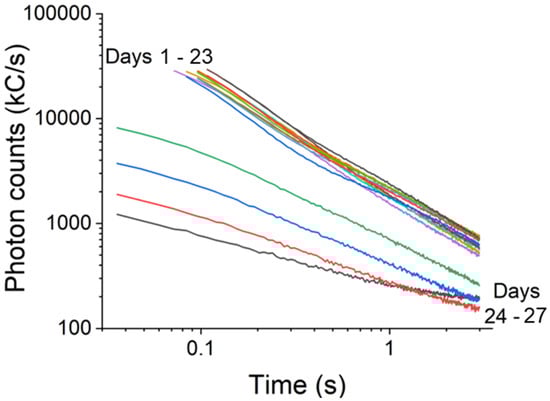 We finally examined chronic conditions of drought stress with the common house plant Schefflera arbicola under 12 weeks of water deprivation. The S. arboricola is highly robust against drought. In fact, one reason it is such a popular house plant is because it requires very little watering. Under the same instrument conditions, delayed fluorescence scans were taken at the same time every day 48 h apart. Results shown in Figure 9 display that for the first 24 days, the delayed fluorescence traces are nearly superimposable on one another. The delayed fluorescence intensity decreases very slightly with each day of water deprivation, and the fluorescence lifetimes remained mostly constant.