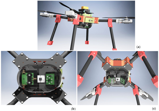 Conceptual design of a drone-based York DF Photon Counting Biosensor. (a) Top image shows the full view of the drone-integrated York DF Photon Counting Biosensor with PCS121 electronics, SiPM bias supply and amplifier integrated into the drone body; (b) Left image reveals the belly view of the optical elements of the device within dome, including the SiPM, target camera in the center, and excitation LED; (c) Right image displays a hovering drone bottom view. Credit: Biosensor integrated drone design by Haktan Yağmur [54].