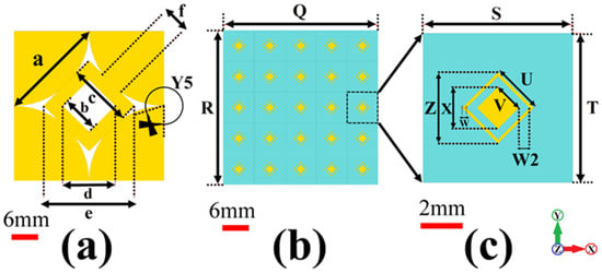 The unit cell of the MTM proposed for the microstrip patch antenna is shown in Figure 1b. It consists of two concentric rhombuses made of copper. The dimensions of these concentric rhombuses are shown in Table 1. The AMC consists of a 5 × 5 array of these concentric rhombuses on top of an FR4 substrate (flame retardant type 4) due to its low cost and the fact that it provides adequate electrical insulation and high mechanical strength, with a bottom defected ground structure. The bottom defected ground structure is shown in Figure 1c. The AMC has designed the CST simulator.