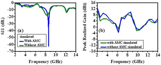 Figure 6b and Figure 7b demonstrate the peak realized gain of the antennas with and without AMC structure. The realized gains without AMC structure at the resonance frequencies (return losses at the lowest value) are 8.24617 dBi and 9.12 dBi for simulated and measured results, respectively. These results have been obtained as 9.90443 dBi and 10.61 dBi for simulated and measured results, respectively. The results for both of them after the AMC structure is integrated into the antenna can be seen in Figure 7b. Hence, it can be also concluded that the AMC structure plays an important role in enhancing the antenna’s gain.