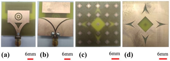 The antenna and AMC structure prototypes are manufactured using an LPKF PCB prototyping machine and the structures are illustrated in Figure 4. As in the numerical studies, the FR4-type dielectric layers have been used to obtain the proposed structure. The antenna’s patch side has complementary two nested circular rings. The background of the antenna is inspired by the Vivaldi shape as in Figure 4b. The top side of the AMC structure consists of 5 × 5 unit cells in Figure 4c. The bottom side of it has a square space with four arrow-type notches, demonstrated in Figure 4d.