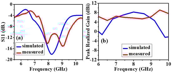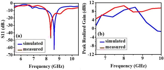 The experimental and simulated results of the antenna without the AMC backing are shown in Figure 6 and Figure 7. The slight difference in the results is due to the fabrication defects and the use of soldering to feed the antenna with an SMA connector. This section compares antenna performance with and without the AMC structure concerning the return loss and realized gain parameters. In the analysis of the antenna without the AMC structure, the return losses at the lowest peaks have been monitored at 8.24 GHz with 18.09 dB for simulated results and around 7.905 GHz with 14.138 dB, and 9.02 GHz with 15.124 dB for measured results, illustrated in Figure 6a. When the AMC is placed below the antenna, the return loss is further minimized, and the radiation is significantly improved, and these results are shown in Figure 7a. As to the analysis of the antenna with the AMC structure, this result has been observed as 8.6 GHz with 62.515 dB for the simulated results and 8.33 GHz with 47 dB for the measured results, illustrated in Figure 7a. Although there are small frequency deviations between the simulated and measured results, it can be seen from these results that the AMC structure immensely improves the return loss parameters.