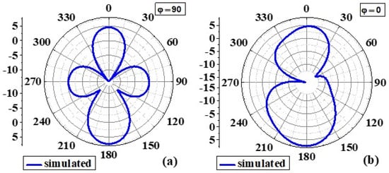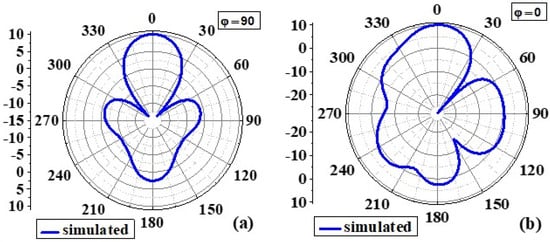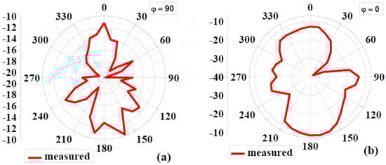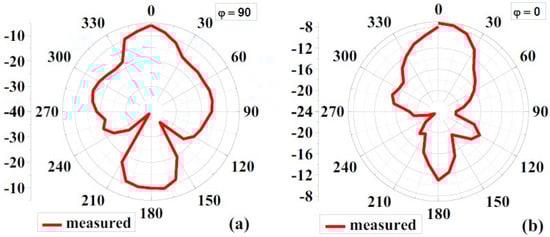 Figure 8 and Figure 9 show the simulated 2D radiation patterns of antennas without the AMC configuration and antennas with the AMC configuration in the xz (phi 0) and yz (phi 90) planes, respectively. As previously described, the AMC configuration reduced dorsal and focused radiation in a broad lateral direction. Compared to an antenna without an AMC structure, the antenna with an AMC structure exhibited more directed radiation. Strength is enhanced along the side of the bore using the proposed AMC. The structure lowers surface waves. This shows how the use of the AMC enhances the radiation characteristics such as gain, directionality, reflection coefficient (S11), etc. []. Figure 10 and Figure 11 show measured 2D radiation patterns for resonant frequencies in the principal planes. The antenna is measured in a lab using theta stepping and rolling on the phi axis. Theta and phi spherical coordinate tables record the measurements. The following is how the spherical coordinates relate to the Cartesian axes: Theta = 0 for 360 and Phi = 0 for XZ Cut, Phi = 90 for YZ Cut, and Theta = 90 for XY Cut. The xz plane (φ = 0) and the yz plane (φ = 90) are referred to as the E and H planes, respectively [,].