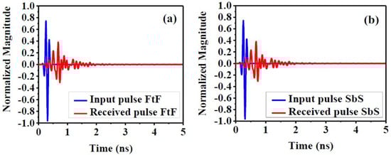 The RX and TX pulse graphs show that the SbS and FtF directions have little attenuation in signal reception. In addition, between the transmitted and received signal, the maximum magnitude of the cross-correlation between them identifies the fidelity factor. What is mentioned in Equation (1) can be determined [,,]. Figure 12a,b shows both the input signal and the received signal so that the spacing between two proposed homogeneous antennas is 200 mm and both SbS and FtF directions are shown.