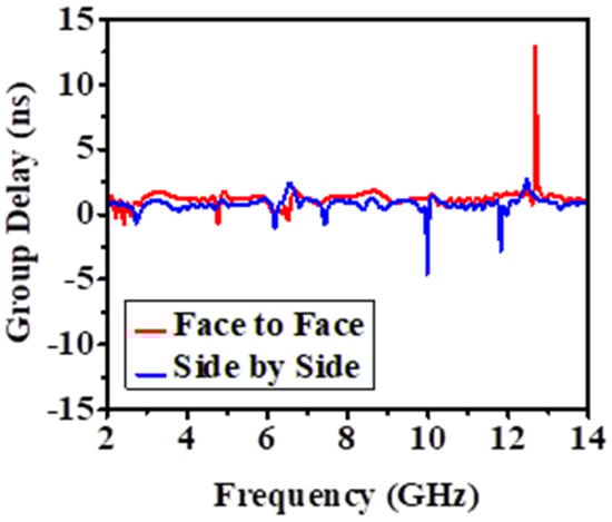 The difference (τ) as a function of frequency for both SbS and FtF directions is shown and explained in Figure 13. The group delay (τ) can be defined as the time delay required for signals to propagate from the transmitting end to the receiving end. Equation (2) explains the determination of the group delay (τ) [,].