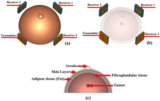 (a) and (b) simulation setup for MWI, (c) breast phantom.