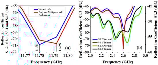(a) Reflection coefficient with the presence of only one malignant cell inside the breast phantom. (b) Reflection coefficient (S-parameters) (S1.2 and S1.3) with the presence of tumor inside breast phantom.