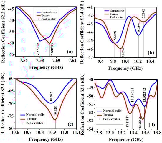 Figure 16 indicates that the presence of a tumor in a cell not only shifts the peak center of the scattering parameters to the higher operating frequencies when compared with a normal cell, but also has more significant reflections. For instance, in Figure 16a, the S2.3 peak center shifts from 7.58025 GHz to 7.59203 GHz, with a larger reflection value due to the tumor. Similar behavior can be noticed in the S2.4 parameter, as shown in Figure 16b, except at higher operating frequencies, the S2.4 value for a cell with a tumor is less than a normal cell. Although the frequency shifts in the S2.1 and S3.1 responses are not as large as the ones obtained in the S2.3 and S2.4 responses, stronger reflections of the presence of the tumor are expected. This could be extremely useful in detecting a tumor. In the next steps, we hope that we are able to chemically fabricate the breast phantom to have the same dielectric properties as a real human breast, in order to deploy the fabricated antenna and experimentally measure it.