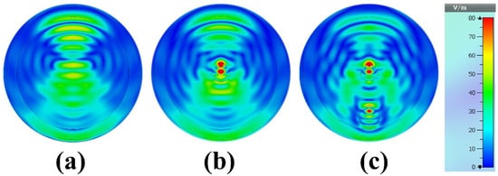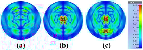 Figure 18 shows the color map magnetic field distribution for the reconstruction phantom without tumor, with one tumor and with two tumors at the resonances frequency of 8.6 GHz. As we can see from Figure 18a, the magnetic field is more localized around the phantom when there is no tumor, the magnetic field is distributed at the center of the phantom when there is a tumor, and the magnetic field is distributed around the phantom when there are two tumors. The proposed MWI system has some advantages over other published articles in terms of size, compactness, and cost-effectiveness. The proposed design exhibits better performance for the breast phantom, which is promising for early-stage tumor detection.