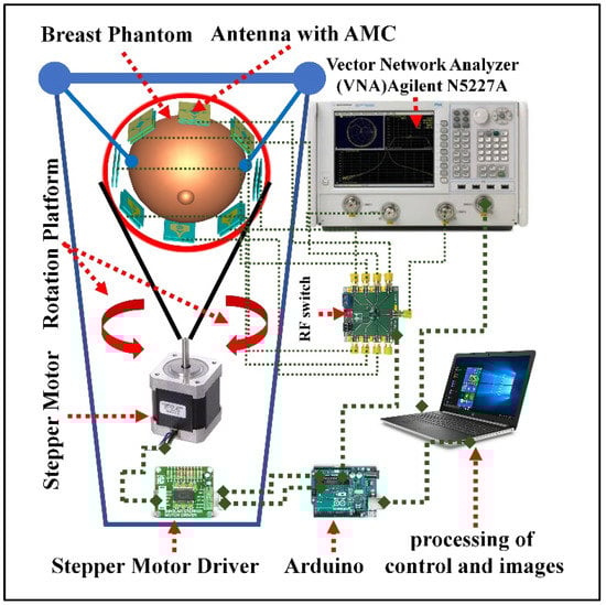 We can summarize the microwave imaging system as explained in Figure 19 so that it shows the architecture and different parts of the proposed imaging system for the breast phantom. The designed MIS consists of eight antenna arrays, where one antenna acts as a transmitter and the other seven antennas receive scattered signals, an 8-port RF converter system to control the receivers, a convenient suspension platform of the breast phantom, and a MATLAB-based laptop computer program for signal processing and image reconstruction of the different components of the breast phantom on the basis of the scattered signals data collected by the receiving antennas. The antennas should be arranged for this application on a transparent, circular ABS plastic container so that it is suitable for rotation around the breast phantom while scanning. The plastic container should be mounted on a stepper motor with an SD02B controller. During the scanning, the suspension platform is used to place the phantom in the antenna array; this arrangement should be such that the distance between the placed antenna and the breast phantom is kept at 2 cm. It is very important to be able to change the angle of the antennas during scanning in order to obtain excellent results and high-quality images, so the step motor on the mechanical rotation platform should be able to rotate the array in polar coordinates from 0 to 180 degrees. Using a special type of wire known as a coaxial wire, all antennas are connected to the RF switch. Microwave signals in the frequency domain to be dedicated for this type of scanning are produced and sent to the breast phantom through port 1 of the VNA. The backscattered data (S21, S31, S71) are collected via VNA (Agilent N5227A, Keysight, Colorado Springs, CO, USA) and MATLAB program on PC. In general, the abundance and deficit of received data depends on the number of antennas, the number of scans, and the scanning angle of the antennas with the breast phantom.