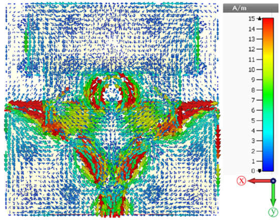 Figure 20 shows the surface current distribution for the proposed antenna-loaded artificial magnetic conductor. As we can see from the figure below, the surface current flows from the two microstrips and distribution for both sides also flows in a parallel and anti-parallel direction around the circular patch, in agreement with other methods [].