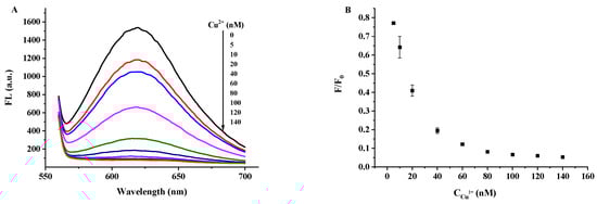 The Cu2+ concentration towards the fluorescence quenching of the DNA2-Ag NCs was studied. As shown in Figure 8A,B, when the Cu2+ concentration was between 5 nM and 140 nM, the DNA2-Ag NCs quenching (F/F0) gradually increased with the increased Cu2+ concentration (F0 and F refer to the fluorescence intensity of the DNA2-Ag NCs in the absence and presence of Cu2+ ions, respectively). Meanwhile, the quenching efficiency ((F0 − F)/F0) reached 90% when the Cu2+ concentration was higher than 60 nM, which indicated that the fluorescence of the DNA2-Ag NCs was sensitive to the change in Cu2+ concentration. To further investigate the mechanism of the quenching effect, the Stern–Volmer equation was used [20]: