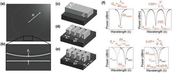 Three metrics that are particularly valuable for evaluating SiP sensor performance and comparing different resonator architectures are the bulk sensitivity, Sb, quality factor, Q, and intrinsic limit of detection, iLoD [21,27]. The bulk sensitivity is defined as the change in λres for a one unit change in the bulk refractive index [27]: