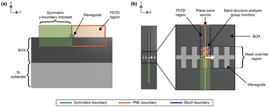 (a) Illustration of cross-section of finite difference time domain (FDTD) band structure simulation setup. (b) Illustration of top view of FDTD band structure simulation with magnified view of waveguide region.